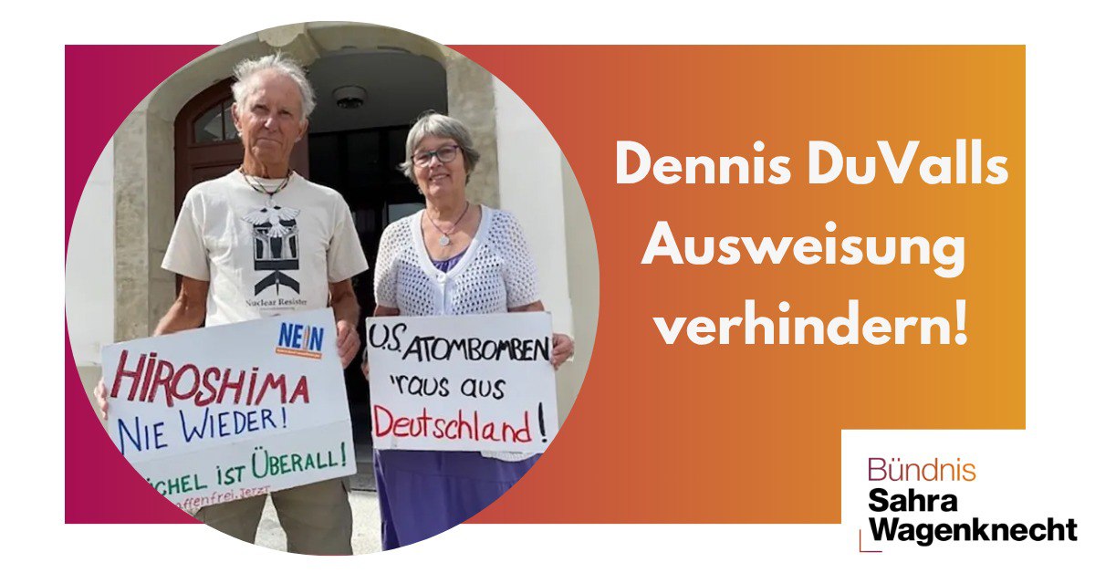 28.10.2024 – BSW MdL Nico Rudolph: Dennis DuValls Ausweisung verhindern! Der in Radeberg lebende 82-Jährige US-amerikanische Friedensaktivist und Atomwaffengegner Dennis DuVall soll aus Deutschland ausgewiesen werden, weil er die Sicherheit […]