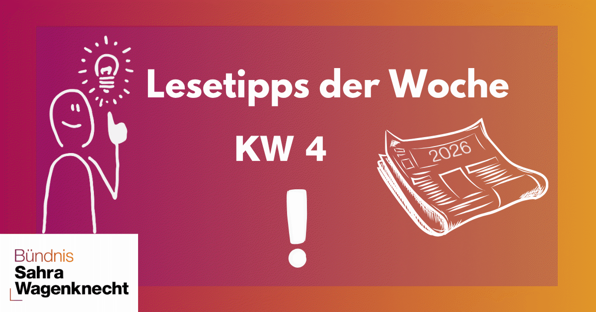 In dieser Rubrik erscheinen wöchentlich ausgewählte Beiträge aus unabhängigen, meinungsstarken Medien. Zusammengestellt von meinem wissenschaftlichen Mitarbeiter, bieten die Lesetipps fundierte Analysen, unbequeme Fragen und neue Blickwinkel auf Themen, die auch meine Arbeit im Landtag prägen: Frieden, Europa und die gesellschaftliche Entwicklung in Ostdeutschland.